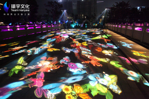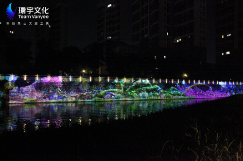 在河道一侧的石头墙体上,环宇团队克服光线及墙面坑洼的难题,在一次次调整方案后,最终利用投影技术将传说中的“千花洲”复刻在眼前,画中的一草一木、一禽一兽仿佛都活了过来:花间纷飞的彩蝶,林中奔跑的异兽,夜色中绽放的灵花……